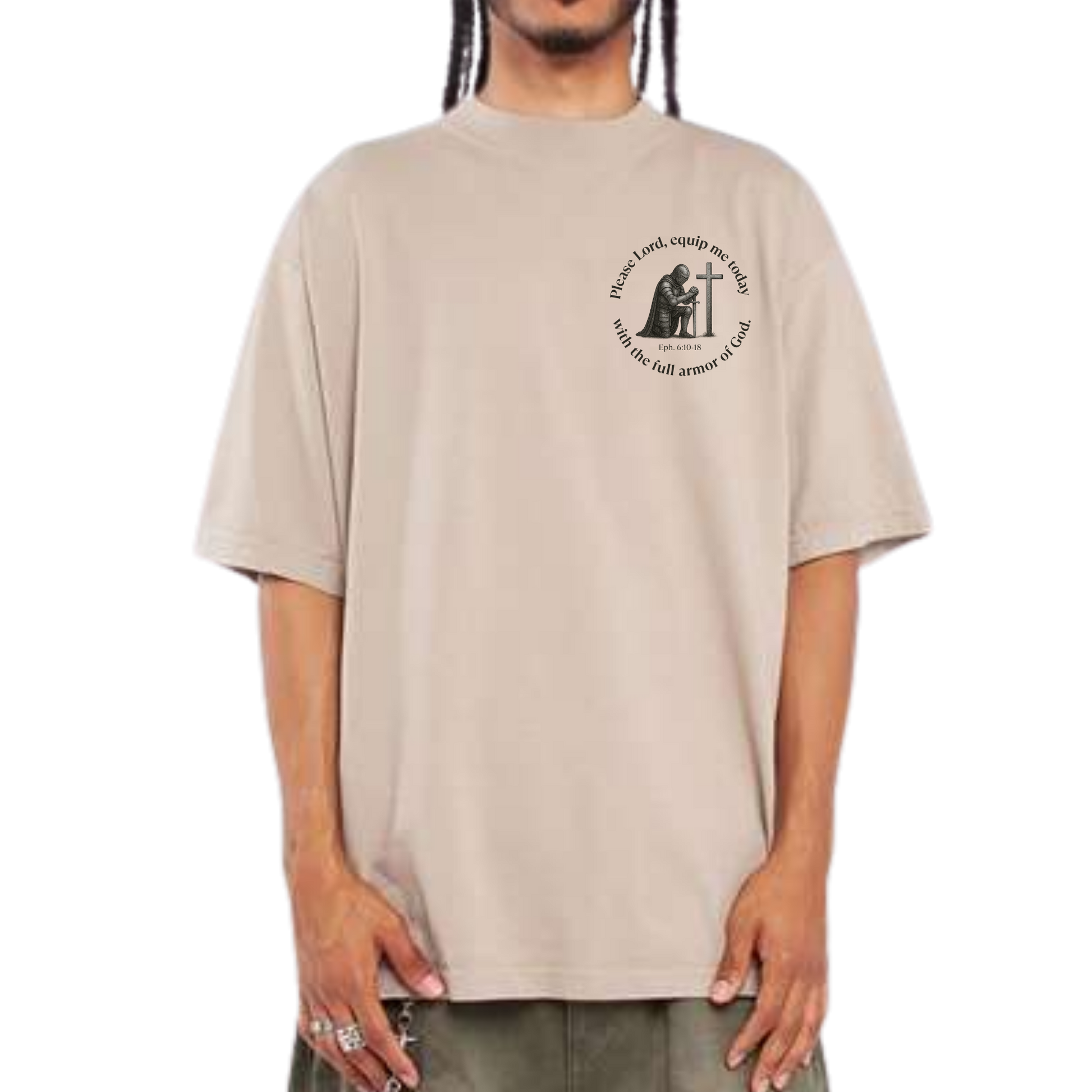 Part of our Christian Collection, the Full Armor of God tee is inspired by Ephesians 6:10–18, a reminder to put on the armor of God daily. The front left chest features a smaller version of the knight design with the prayer: “Please Lord, equip me today with the full armor of God.” The back showcases the full artwork, bold and powerful.